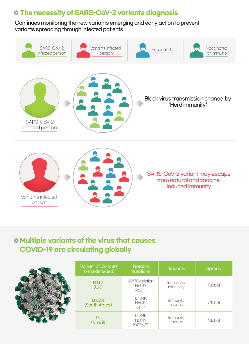 AccuPower® SARS-CoV-2 Variant ID Real-Time RT-PCR Kit(Premix type) is an in vitro diagnostic kit that helps diagnose SARS-CoV-2 variants. The spike gene (S gene) is the key region to monitor the mutants with the recent arising from emergence variants from SARS-CoV-2. The kit is able to detect 5 genes about S gene mutation hot-spots in 2 tubes. Sputum, nasopharyngeal swab and oropharyngeal swab from suspected infection patient’s sample can be used.
