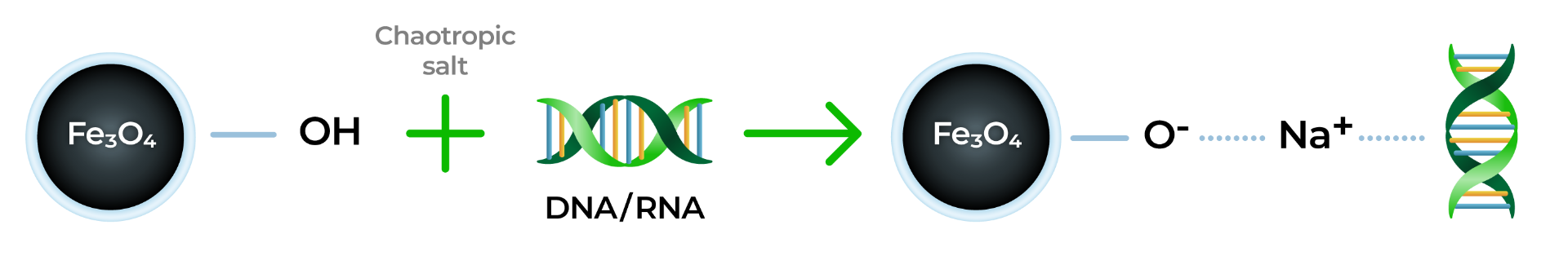 BIONEER’s Silica-coated Magnetic Beads are products with high-density silica (SiO2) coating on the paramagnetic material, magnetite (iron(Ⅱ,Ⅲ) oxide, Fe3O4) surface. Depending on the size, Silica-coated Magnetic Beads are available as micrometer-sized AccuBead™ (1 - 5 μm) and nanometer-sized AccuNanoBead™ (200 nm/400 nm). All magnetic beads developed by BIONEER have pure magnetite as a core. Compared to other beads that use a polymer core, BIONEER’s magnetic beads have higher magnetic saturation, allowing for faster collection by a magnet. This enables more rapid separation and purification of target biomolecules. Additionally, BIONEER’s technology attaches more functional groups to the same surface area, allowing for capturing more target biomolecules with the same volume of magnetic beads, thus maximizing experimental efficiency. The hydroxyl groups of silica bind to sodium cations, which in turn bind to nucleic acids (DNA/RNA) in the presence of chaotropic salts (guanidine hydrochloride, guanidine thiocyanate, and sodium iodide). Utilizing this, Silica-coated Magnetic beads can isolate and purify nucleic acids from samples. This product magnetically isolates and purifies nucleic acids using the MagListo™ Magnetic Separation Rack (TM-1000, TM-1010, TM-1011, TM-1020, TM-1030) or other magnetic separation racks.